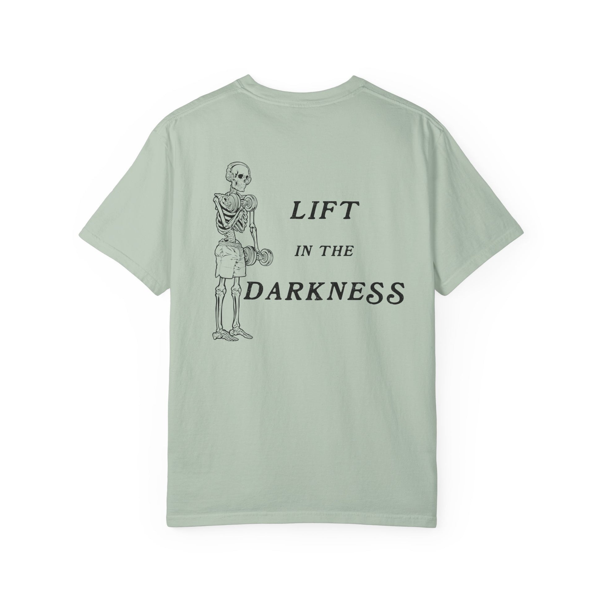 This shirt says what many feel — Anxiety Is My Pre-Workout. A bold, front-facing design that embodies the Lift in the Darkness mission: turning mental strain into strength through movement. Our signature skeleton lifting weights on the back