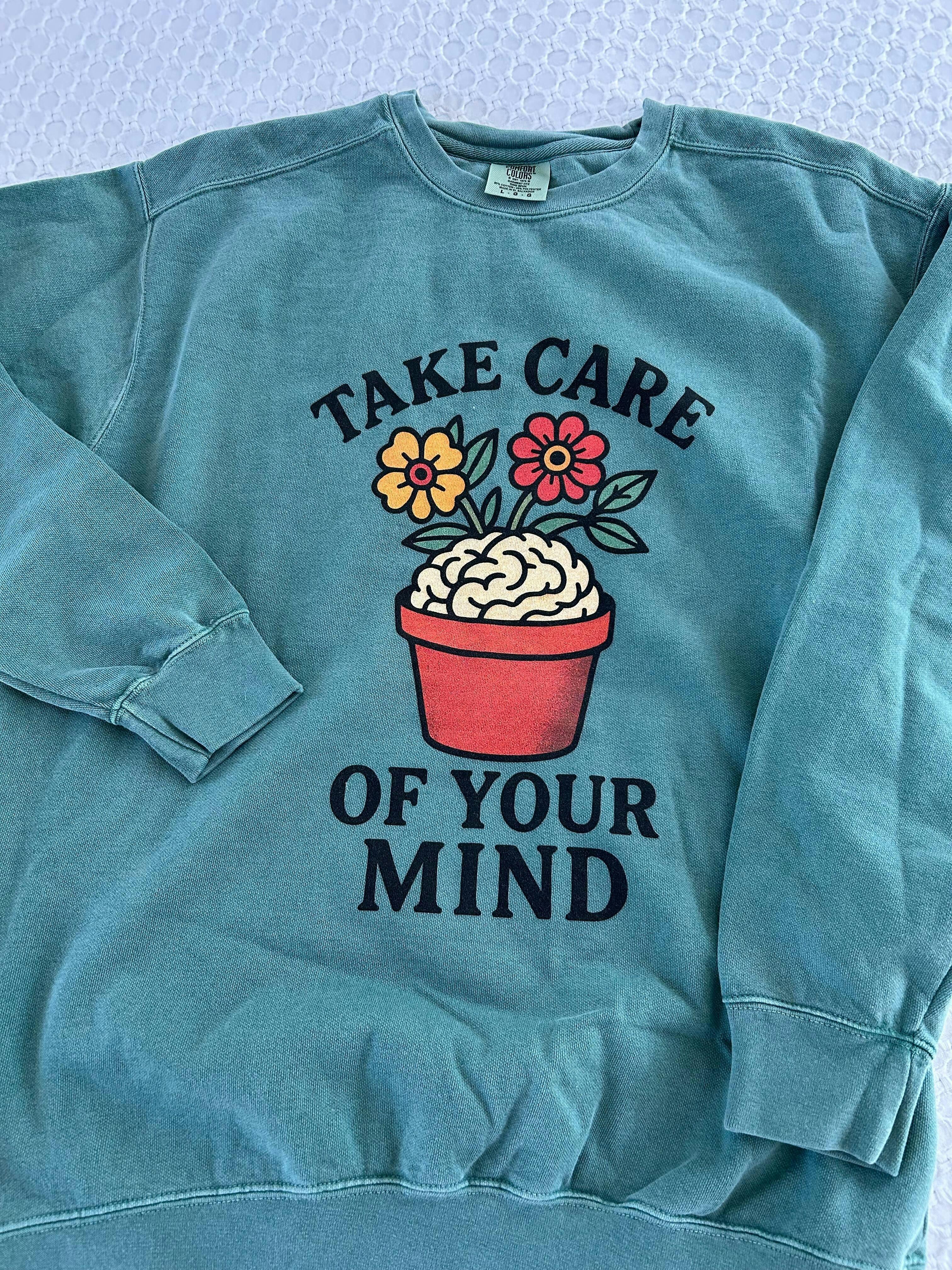 Warmth with a message that matters. This Take Care of Your Mind sweatshirt features a detailed graphic of flowers growing from a brain in a flower pot — a reminder that nurturing your mind is where real growth starts.